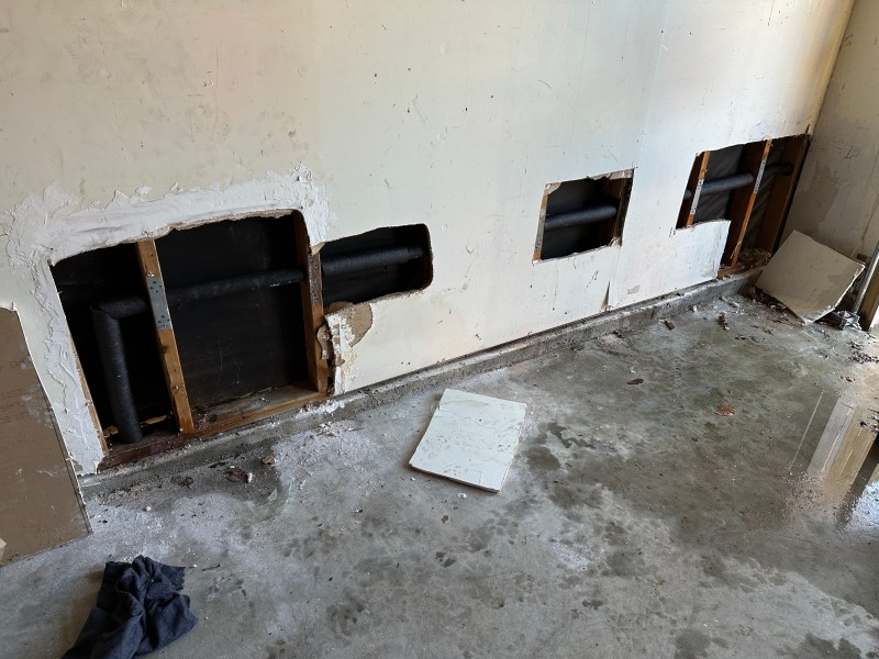 After the weekend the rental company sent a plumber. He found three breaks, fixed them all. Another week or so later the sheet rock guy came and closed the holes in the wall so we are back to normal.