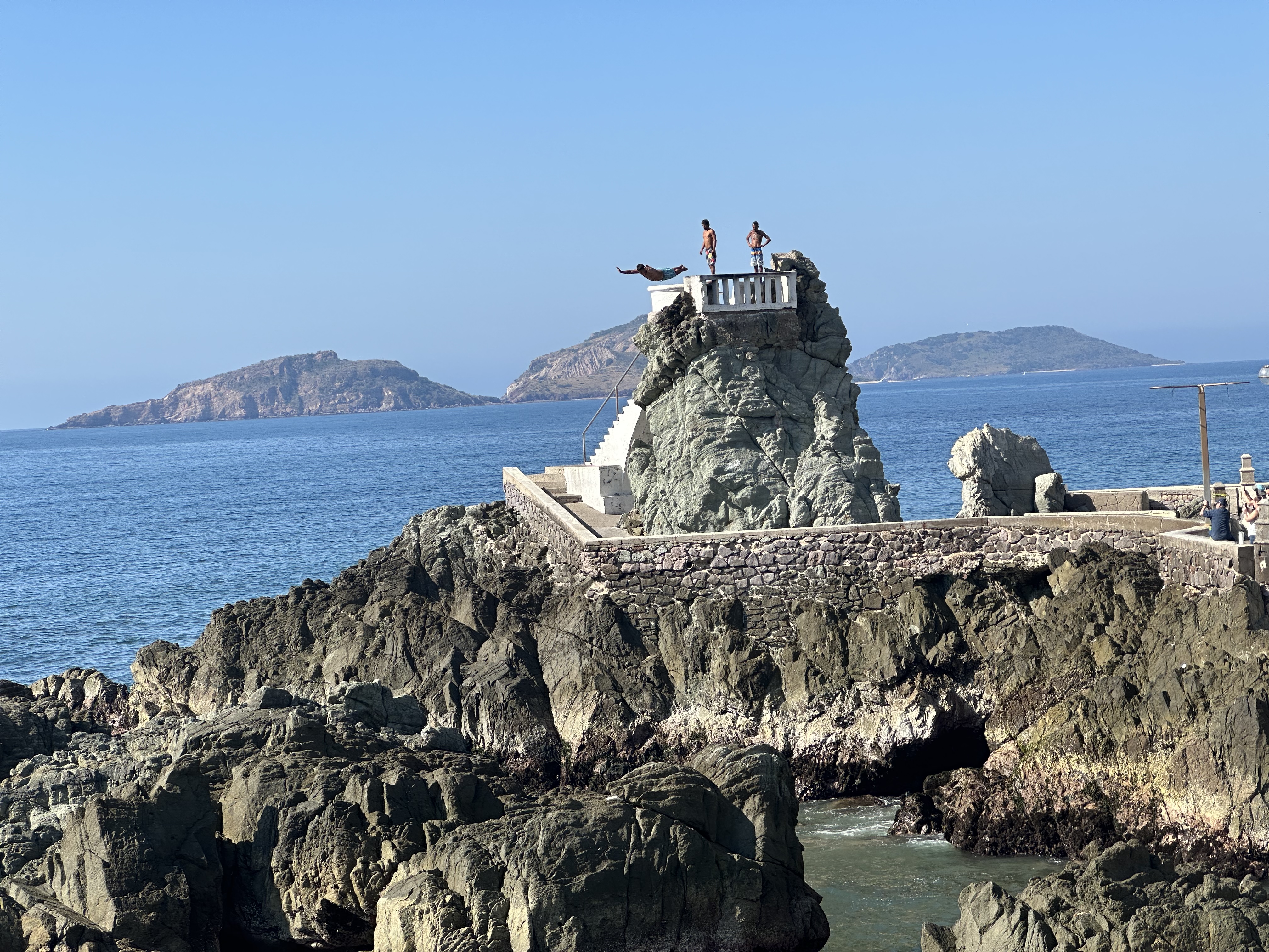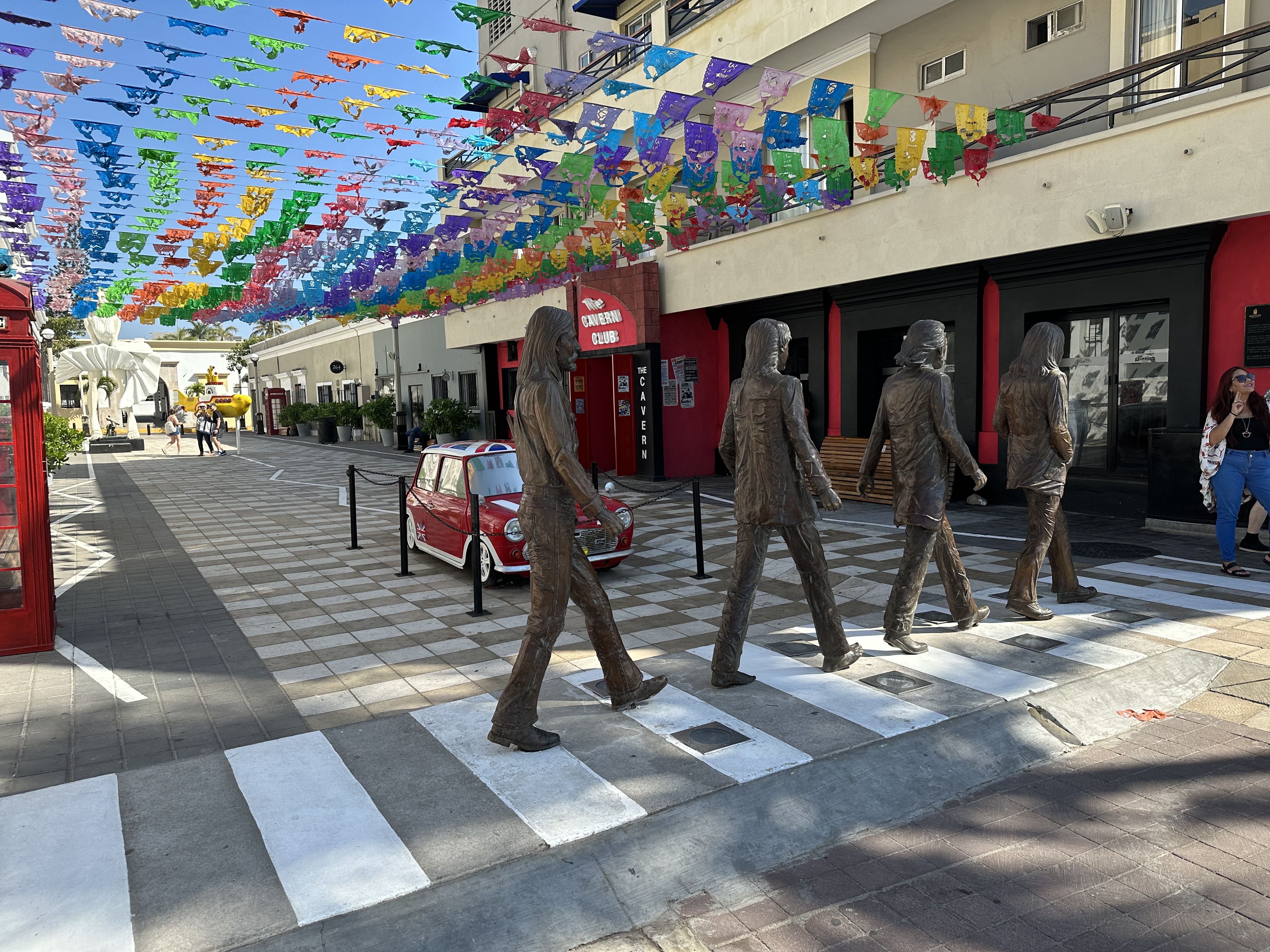 After lunch we walked along the coast where we watched cliff divers defying death. Then we walked back to the boat. Along the way we saw several tributes to singing stars, like the Beatles Abby Road street crossing. There were police everywhere, including a pickup truck with heavily armed forces (and a truck mounted machine gun). But we felt secure, and Mazatlan was our favorite stop.