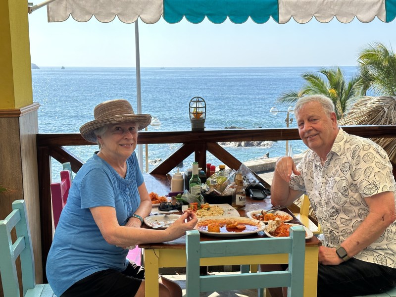 We walked to town and visited their main church. Nice architecture, and as usual, beautiful appointments inside. Outside was nice too, with neighborhoods in colorful paint. We learned that shrimp dishes are local to this area, so we set out to find someplace that featured it. And we did, we found an upstairs restaurant on the beach that served some of the best shrimp ever.