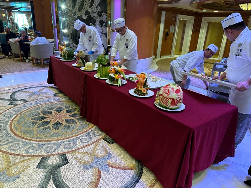 There were a lot of activities to keep us busy. Trivia, bag toss, music, karaoke, and so on. And quite an artistic fruit and vegetable carving. The evening concerts have been entertaining s well.