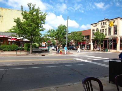 Downtown corner, with local bakery and coffee house