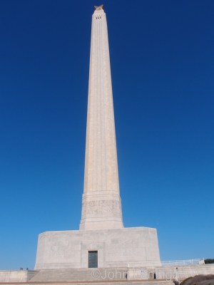 In commemoration of this battle, a monument was built, now open to the public. It is in the Guinness World Records as the world’s tallest memorial monument. The monument weighs 70,300,000 pounds. It is 125 feet square at the base, tapering to 30 feet square at the top. It is faced with blocks of cordova shell stone weighing 500 pounds apiece. This shell stone is over 100 million years old and was quarried from Burnet County north of Austin. The shaft walls are 4 feet thick at the base of the monument and 2 feet thick at the top.