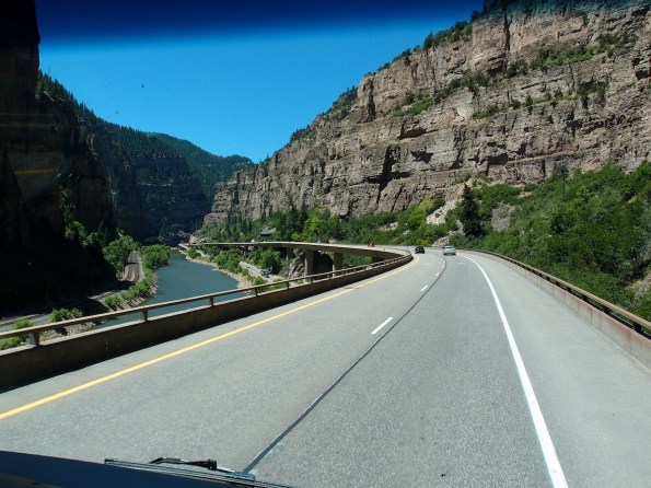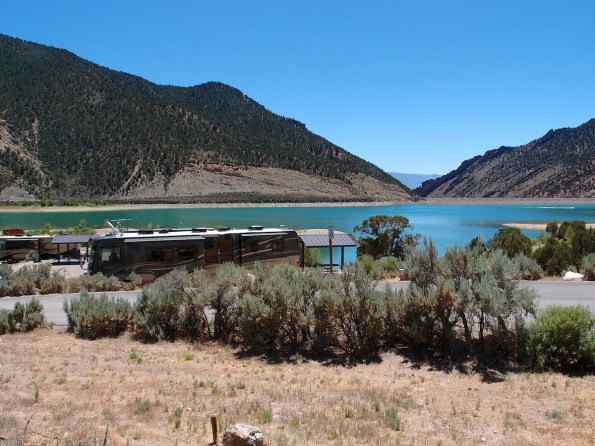 Once we made it to I-70 the scenery wasn’t over, not by a long shot. Now the 4 lane freeway follows the Colorado River, giving more spectacular views. The drive by Glenwood Springs is unique in all the country. We got off at Rifle, and headed north on CO 325 to our campsite at Rifle Gap State Park. That was one narrow little road! But we were rewarded with a beautiful campsite by the lake.