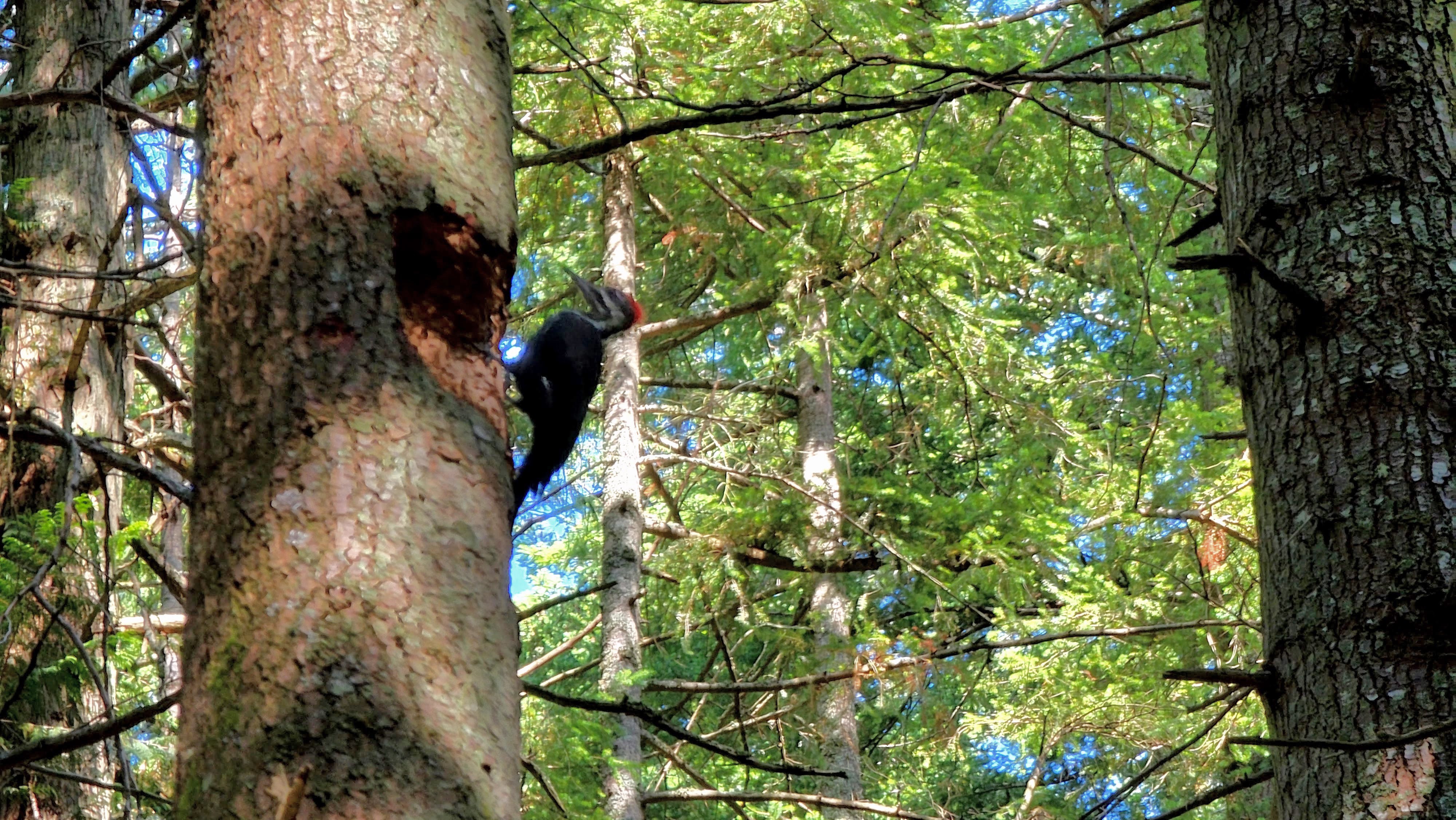 Sure, the lake is pretty but 2.5 miles downhill is hard on the legs too. Most of the trail is just rocky, but you do have to watch out fo roots. Saw a woodpecker hard at work on a dead tree.