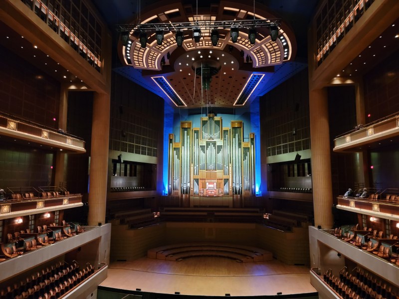 In the photo, you can see the sound baffle in the ceiling, which looks like a giant horseshoe with lights. This assembly weighs something like 50 tons, and can be lowered and tilted to make a sound chamber to suit the music. In the picture, it is all the way up for the mighty organ sounds. But we have also seen it way down for a more intimate performance, an example would have been the Yo Yo Ma concert.