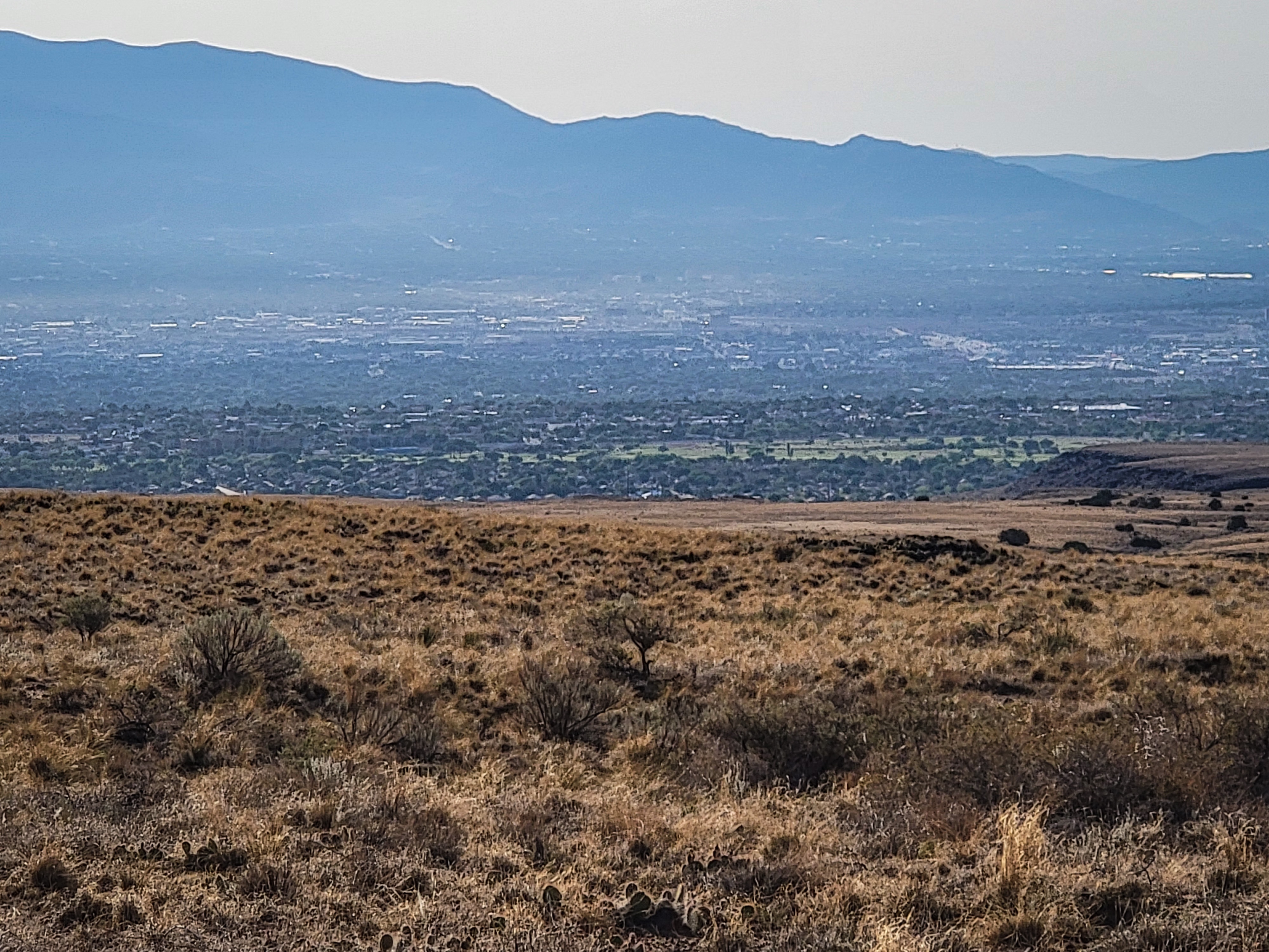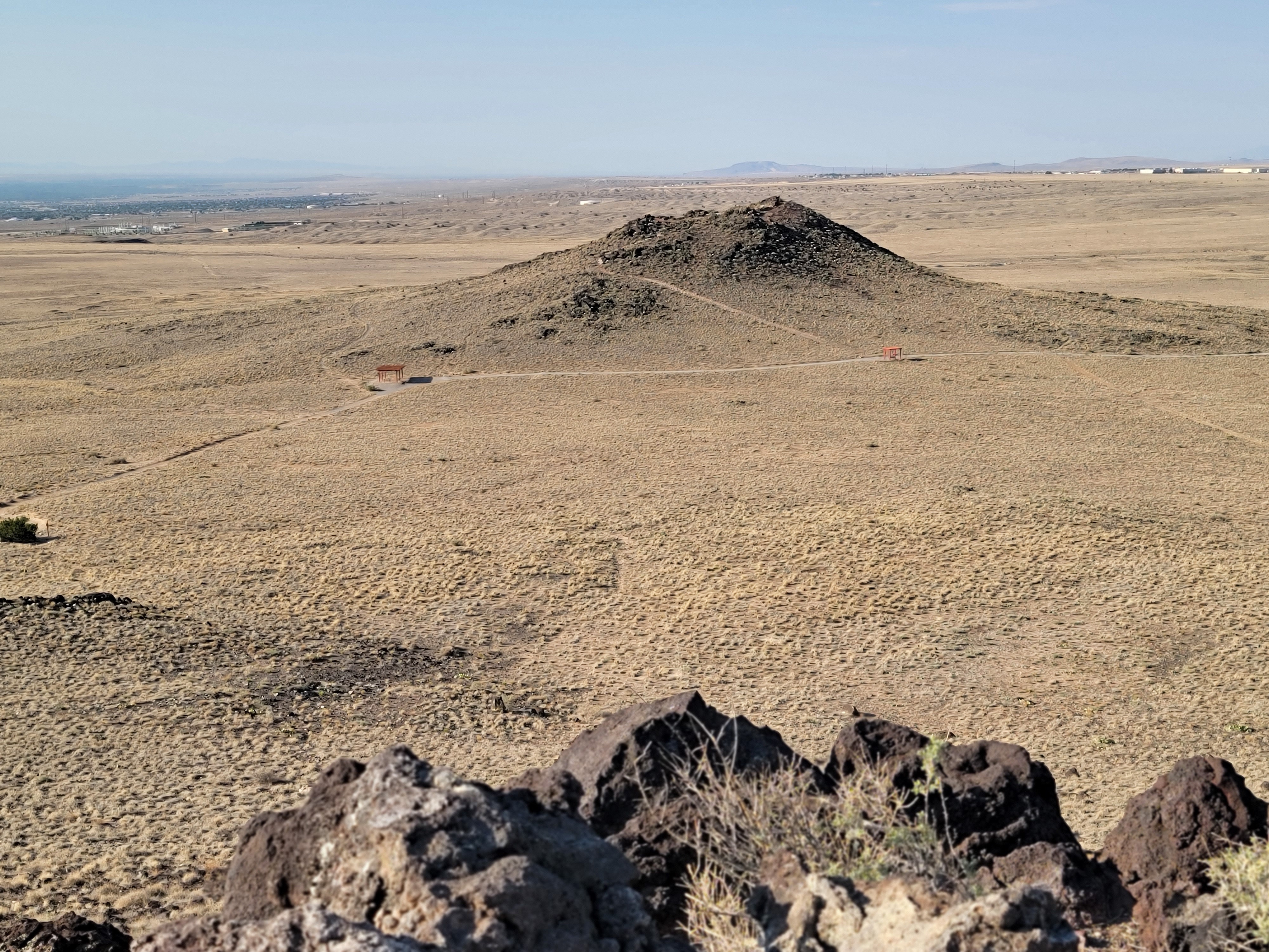 This hike is in the open sun, no shade. It is 3.2 miles long and we had an elevation gain of around 500 ft. Most of it was packed sand and gravel, some pretty rough rocks and steep. We had some great panoramic views, especially from the top of Black. Normally you’d have a great view of Albuquerque, but the heat haze limited visibility somewhat.
