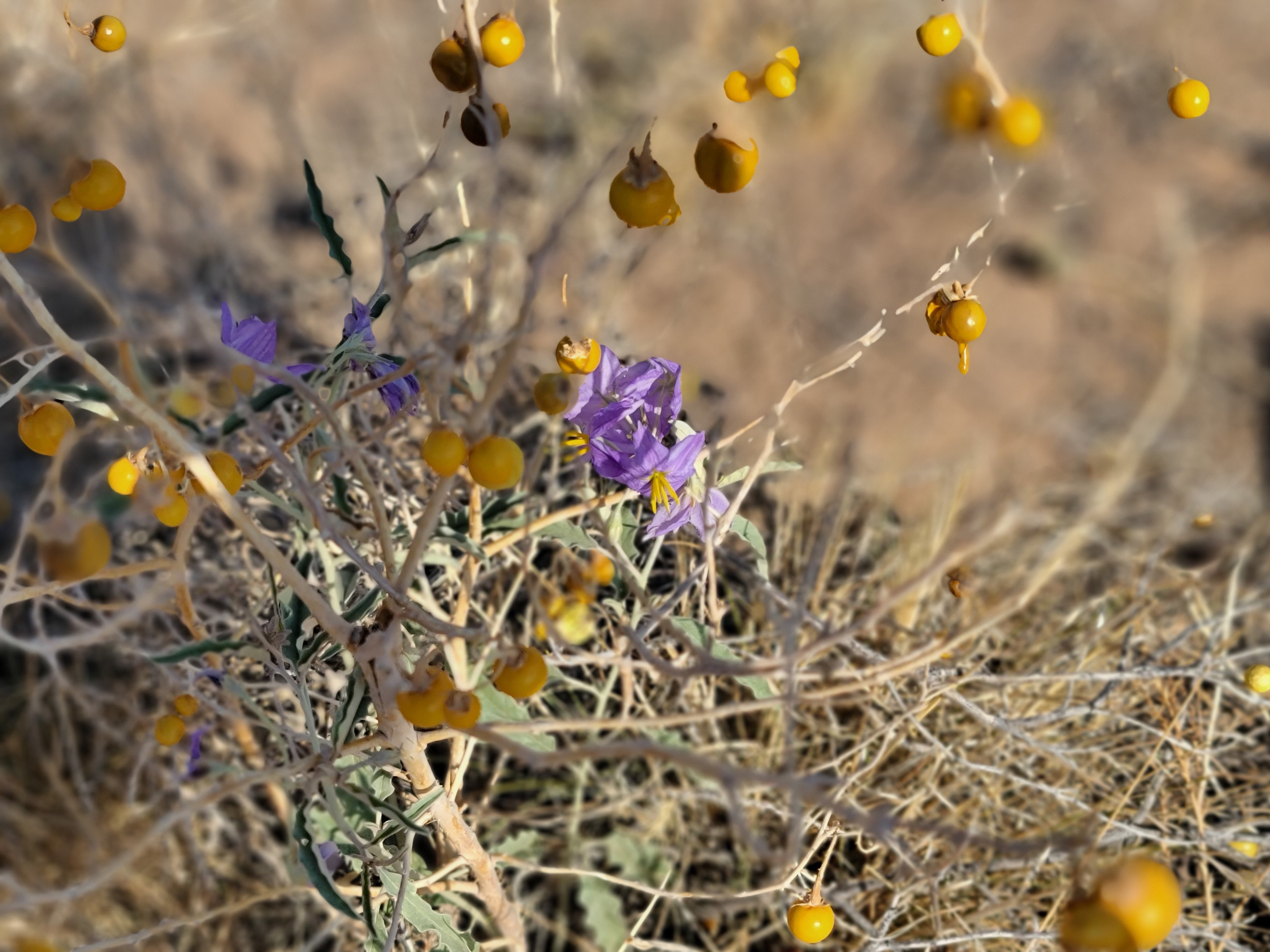 We noticed some interesting plants, including a plant that looked dead but had pretty purple flowers….. and in the same plant yellow berries. These are silverleaf nightshades, also known as desert berries.