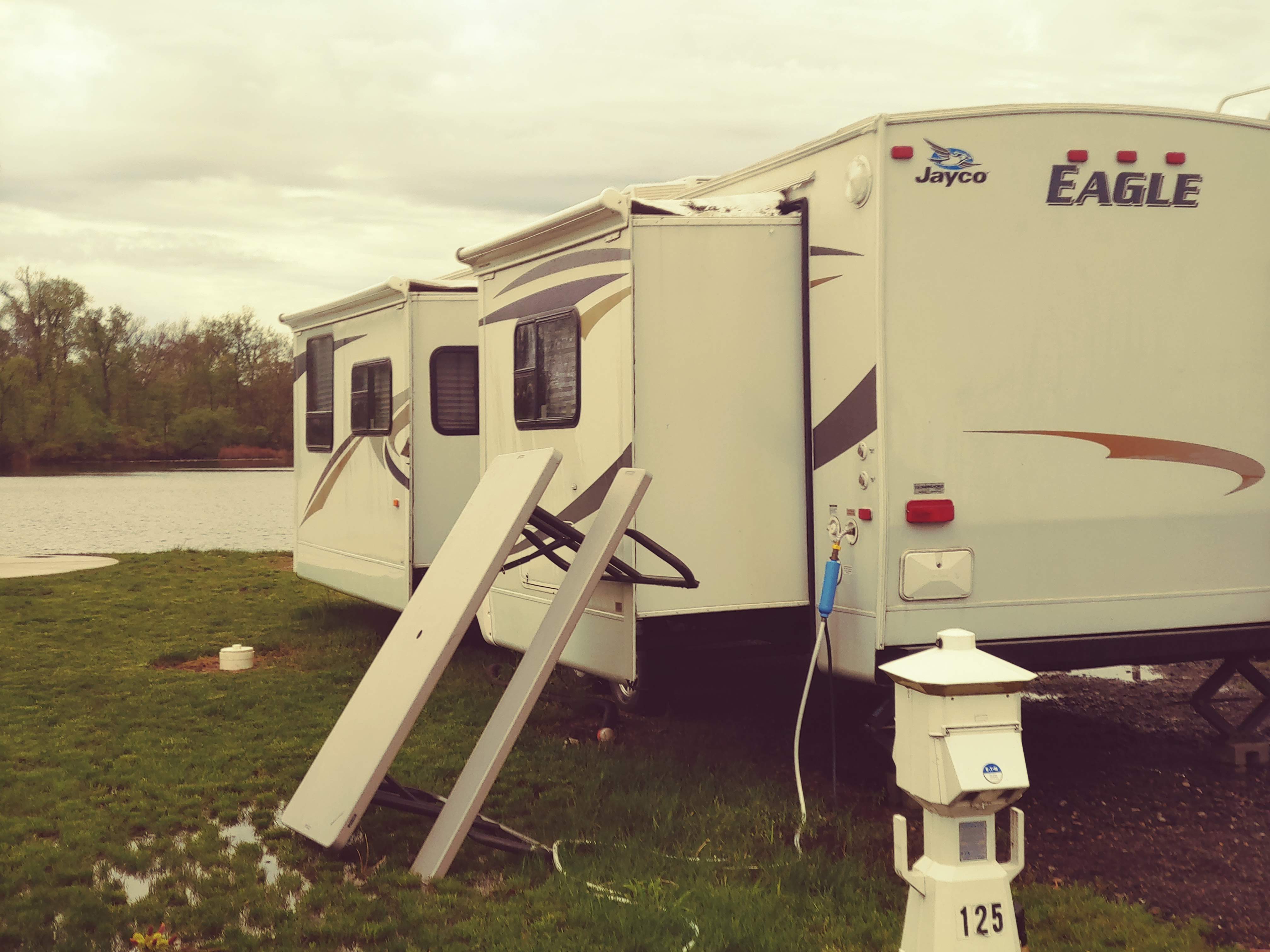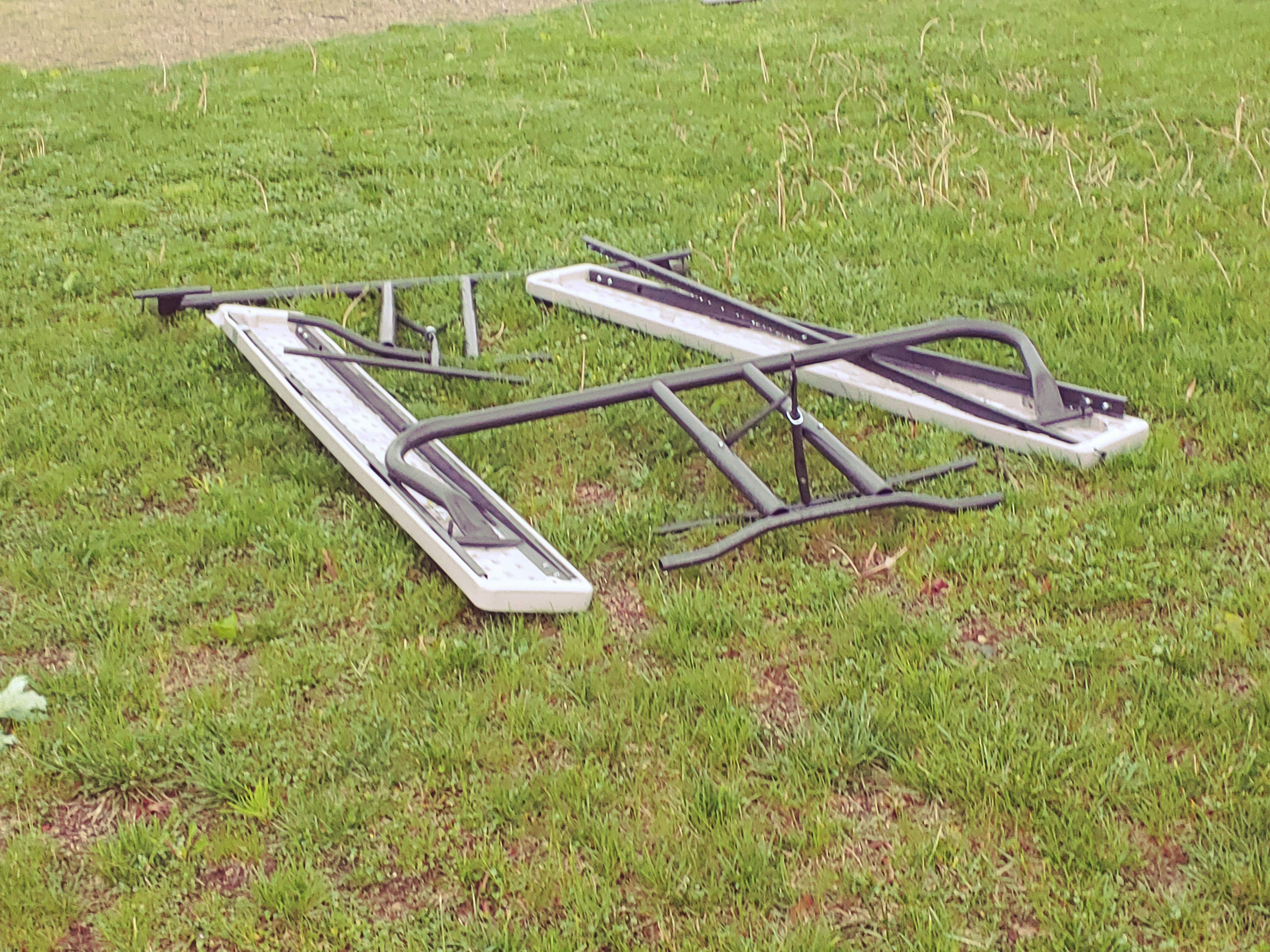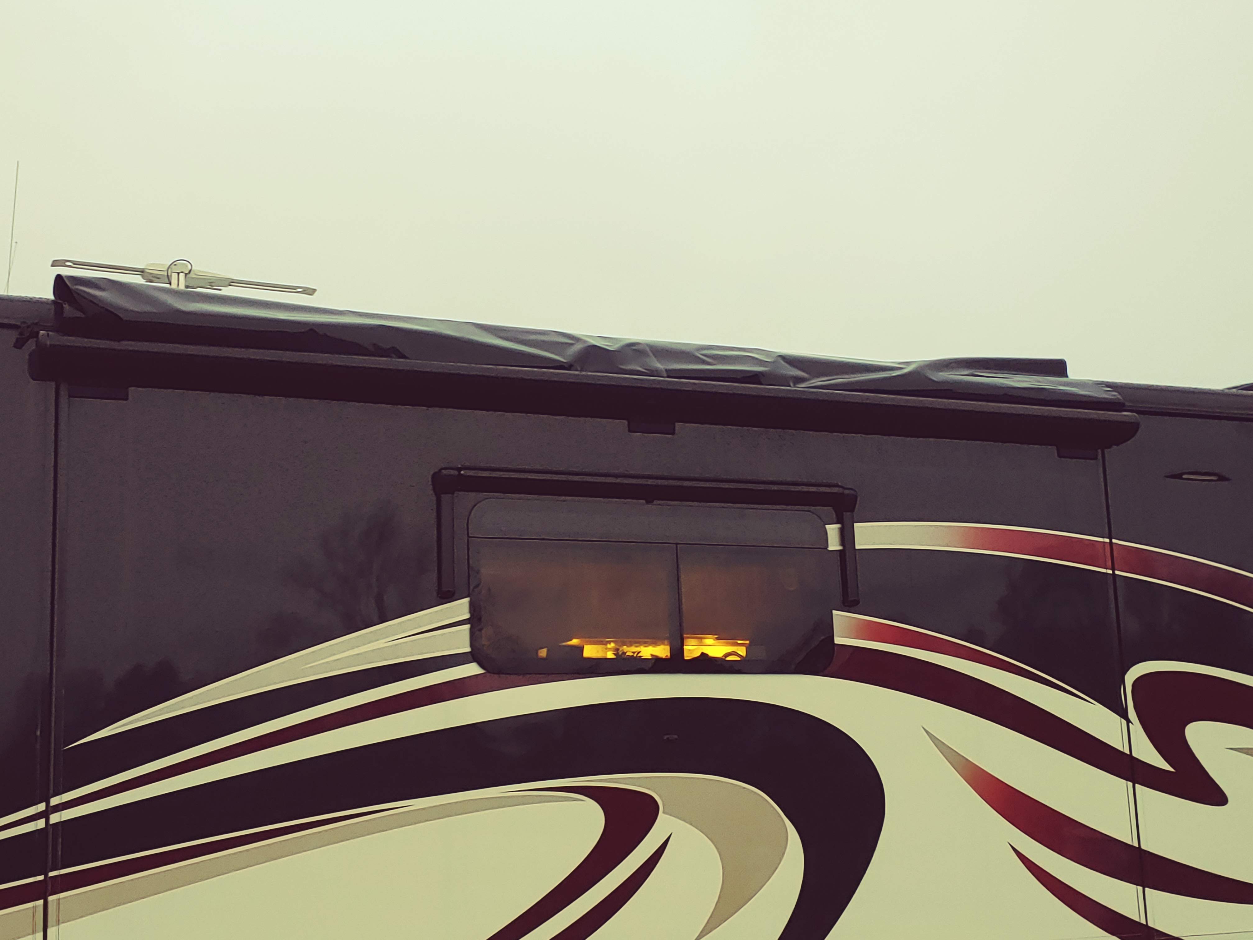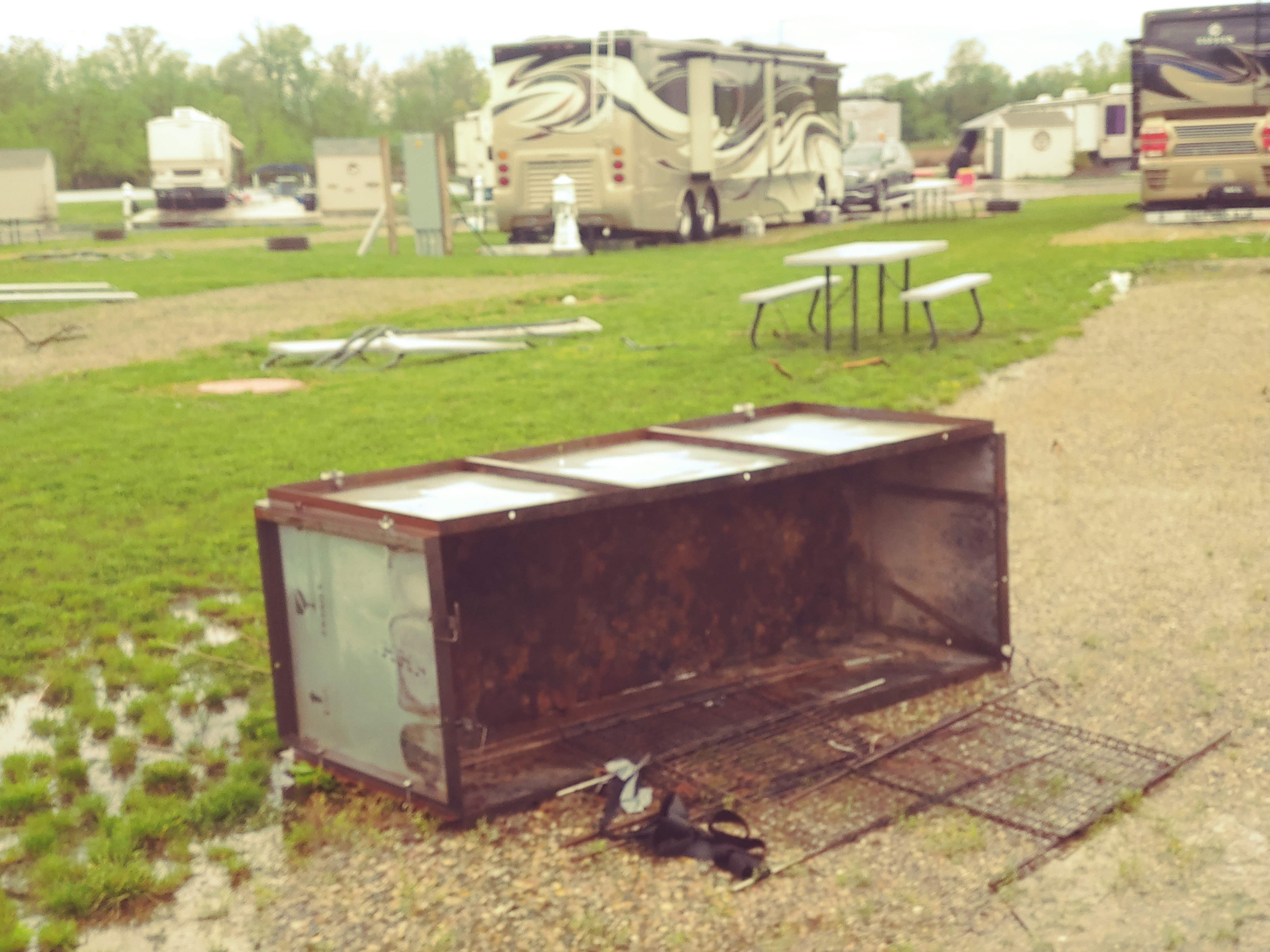 There was an obvious amount of damage. Picnic tables move and smashed, lawn furniture moved about, even a heavy grill was moved and toppled. Even power pedestals were leaning from the wind. Our friends the Cooks lost power. And our slide topper was unrolled, some amount of damage. Later this morning we’ll check it out but for now it appears we missed a potential of major damage.
