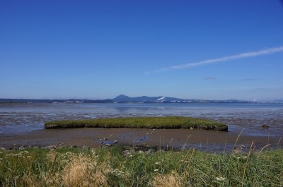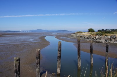 Because the bay is filled with sediment from the Skagit River, the bottom is very shallow, flat, and muddy. It is so shallow that almost the whole bay is intertidal. This means that it is flooded at high tide. When the tide goes out the whole bay empties out, exposing miles and miles of mud flats. This condition allows unusually large eelgrass meadows to grow. There are nearly 8,000 acres of eelgrass in Padilla Bay.