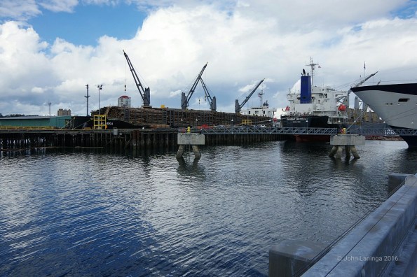 Right next to our berth a logging ship was being loaded. Very interesting to watch, the little tugboats reminded us of sheep dogs, gathering up the herd. But it sure looks like dangerous work, running around on those logs!