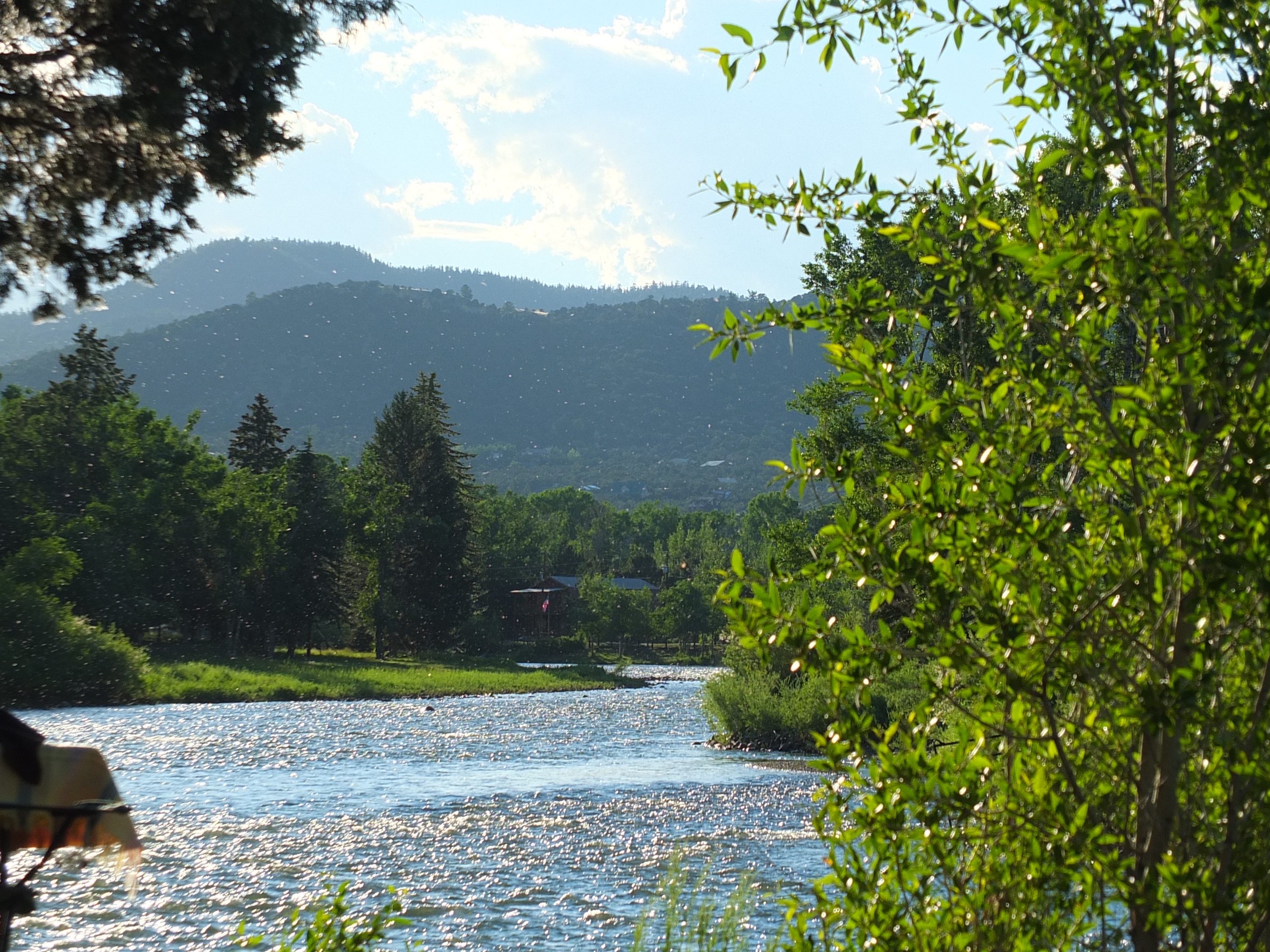 After the July 4th rally Romola and I drove to South Fork. It’s quite a climb over Wolf Creek Pass, we were down to 32 mph up hill. In South Fork, our RV site was right on the river, where we watched fly fishermen, birds, and amazing sunsets. We also stopped at the Grande Premium Meats, a store specializing in wild game meat and bought some elk, bison and venison.