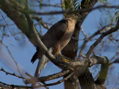 Yesterday, we went for a walk in the Birding center. We were surprised that there were no birds — none at all — in our favorite viewing spot. It soon became obvious why… a Coopers Hawk was sitting high in a tree, looking for a snack. I got some good pictures of the hawk, before he dove into some brush, and with a lot of squawking and screaming, apparently got himself a meal. Too bad I couldn’t get any pictures of that!