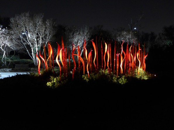 Dale Chihuly is an internationally know artist whose medium is glass. Al sizes, all colors, all shapes. Some subtle, some even bizarre. Currently, there is an exhibit of his work in the Dallas Arboretum. Here, hundreds of his glass “shapes” are installed as a complement (and sometimes as a contrast) to the plants. His works are scattered throughout the 66 acre arboretum.