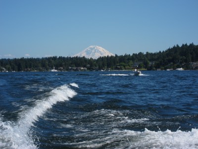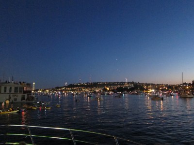 So we took Steve’s boat to their friends dock on Lake Union, where the fireworks were to take place. It was quite crowded with all size boats. As dusk approached, so did a flotilla of boats, from kayaks to yachts, really filling up the bay. A little after 10:00, the fireworks started. The Seattle show is one of the top rated in the nation, and it was fantastic, with some fireworks effects we’ve never seen before. Fantastic!