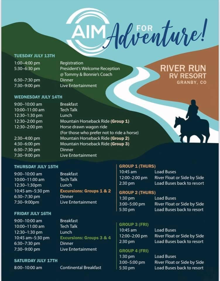 We attended the AIM rally in Granby, CO. Near Estes Park, this location is known for summer and winter activities. It was a great place for AIM to hold their rally. It was held at River Run RV Resort, a huge new park that is still growing.