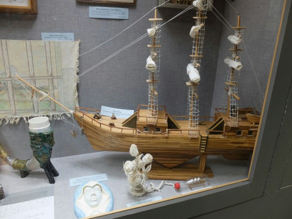 A ship madew from match sticks; a rose from toilet paper